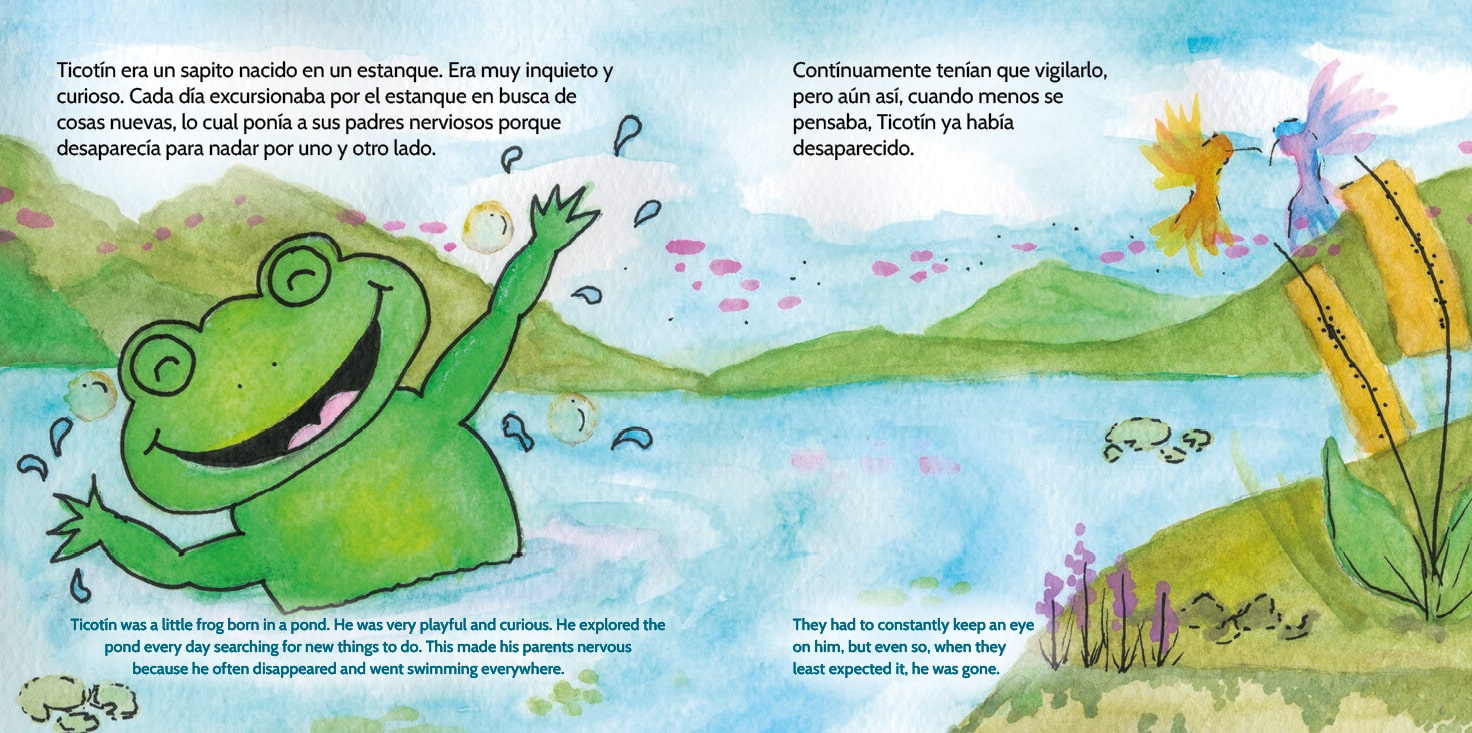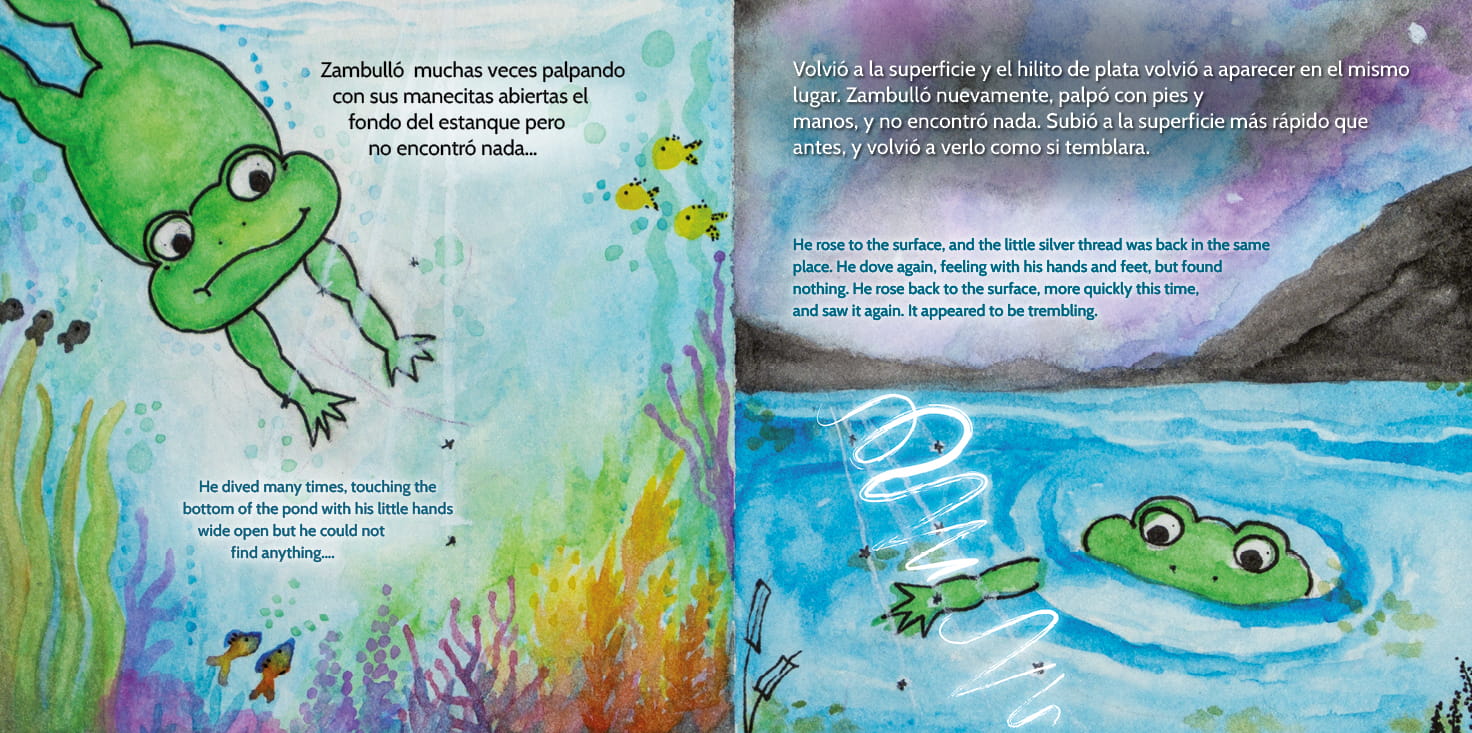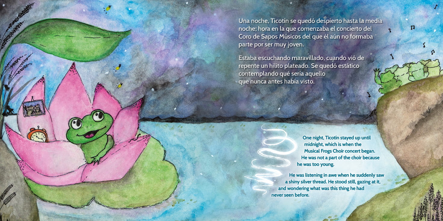 Ticotín is a curious little frog with a boundless sense of wonder. Living in a quiet pond, Ticotín’s adventurous spirit often leads him into mischief and sometimes into trouble. One night, he becomes captivated by a mysterious silver thread shimmering on the water, setting off a journey that stirs up big feelings and even bigger questions.